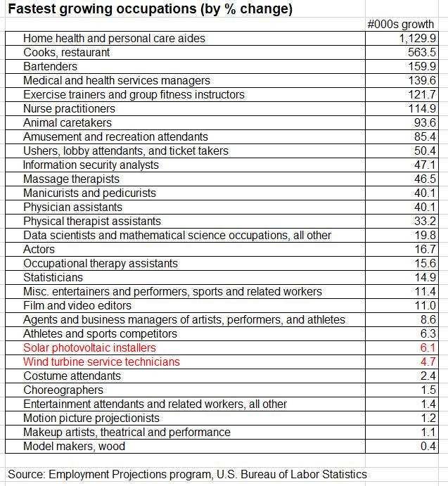 The journalist obviously wanted to gin up the fact that the green energy revolution is going to create massive new jobs. A more accurate story here would have focused on the real jobs that will be in demand - 1.1 million home care workers, 560,000 cooks, 121,000 exercise trainers, 115,000 nurse practitioners - in fact most of the occupations with the biggest expansion are in health care.