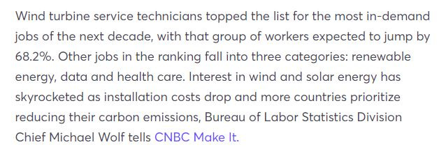 When you read this statement what do you think? That there will be massive new jobs in green energy, of course. The journalist all but tells you that - “Interest in wind and solar energy has skyrocketed” after all.