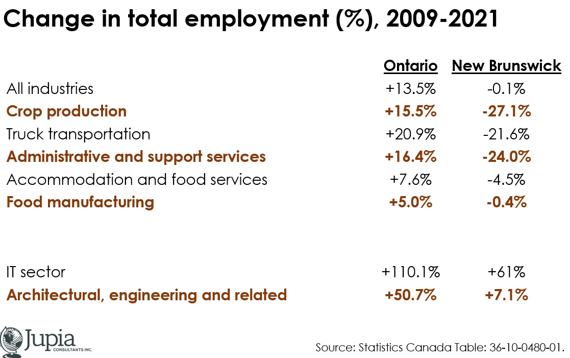 Now, if you go back to the 1990s and early 2000s, New Brunswick was adding jobs in truck transportation and administrative services (call centres). Now we are shedding jobs in these two sectors at a serious rate and Ontario is adding jobs in these same two sectors. Guess who is working in these sectors? Immigrants.